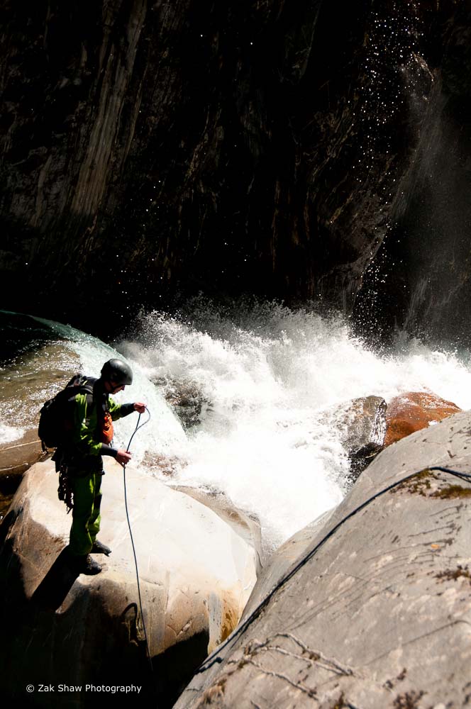 Within the confines of the bedrock walls our speed was regularly halted. On the forefront of our minds was "can we get back out from here" By committing down into the canyon we had to be sure we could climb back out. In shot Dylan Thompson repels off a giant rounded rock to inspect our next move.
