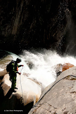 Justin and I sat waiting discussing what we thought would happen. I think our gut feeling was that we would retreat back upstream. Dylan looked at Keith one final time before beginning to run across a smooth low angled wall. Speed helped him continue to move as the wall began to slant vertically. Launching off one leg Dylan sprung out of sight leaping 15 ft off the canyon wall and around the corner. It was a little unbelievable. Justin and I had no choice but to accept it. Persevering solo as far as he could downstream Dylan was confronted by multiple problems and wanted to return upstream. Keith managed to get a rope to Dylan and haul him up out of a cauldron pocket and back into his ledge. Dylan was very unsure and Keith heard to many maybes. "Maybe we can climb along the right wall and jump clear of another waterfall"maybe we can climb a break in the left wall to get past, maybe we would get stuck down in that eddy" Keith had to have a look for himself. The climber in him wanted to find a solution. I thought the solution was desperate and unfeasible but then I wasn't the one seriously considering climbing out from there.