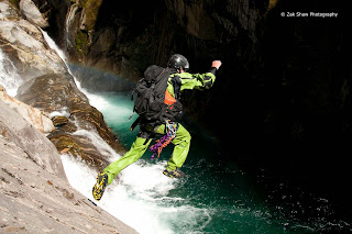 Image above - Keith Riley leaps off a boulder within the canyon. I took this image a few minutes after Keith pulled down our rope which would have provided our escape. At the time I seriously questioned the decision.